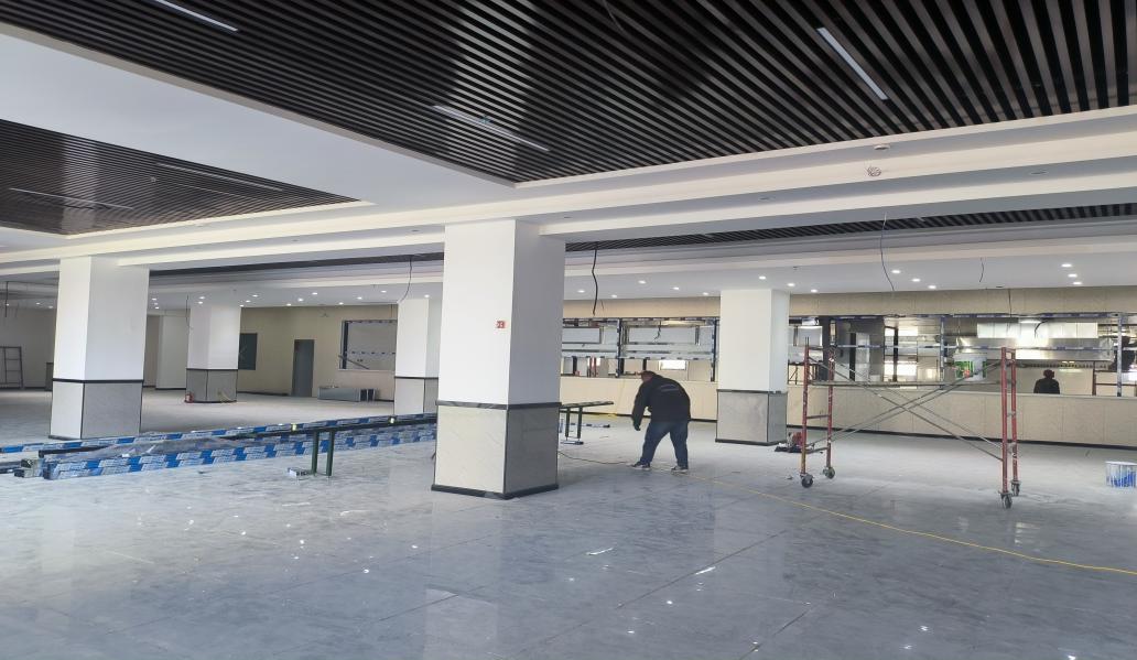 截至目前,已经完成辅助楼装饰装修分部工程中的地面地砖、后厨及卫生间墙砖、内墙抹灰、室内吊顶、后厨轻质隔墙、门窗安装、饰面施工、灯具安装等子分部工程,施工过程中我方与业主单位保持密切沟通,从实际使用角度出发,对施工中的重点、难点进行技术研讨和技术分析,及时确定施工方案、施工措施,对设计中不合理地方及时提出修改建议,在施工过程中采用最优施工方案,使项目竣工后能发挥最大经济效益。